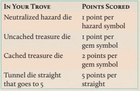So how is single player different? Here, you must draft dice from the top of the mountain like usual, but you’re limited to only being able to draft certain dice. The player starts with 3 randomly rolled “magic dice” that allow you to remove certain dice from the mountain at will throughout the game. You can always grab any magic dice, treasure dice, or tool dice that appear on top. But you can only grab the white tunnel dice if it lets you continue building a straight – for example, I can’t grab a 4 if I don’t have a 1-2-3 going to already place it on. And for the black hazard dice, you can only grab those if you have already picked the right tool dice showing the proper symbol to neutralize it. Eventually, you’ll find yourself in a situation where you are unable to take any of the dice off the top of the mountain at all – here, you can “spend” any magic dice you have to pull 1,2, or 3 dice off the mountain and throw them back in the draw bag for later. And twice during the game, you are allowed to refill the mountain back up to 20 dice at will, but have to choose carefully when to do so. Scoring works as follows at the end of the game: