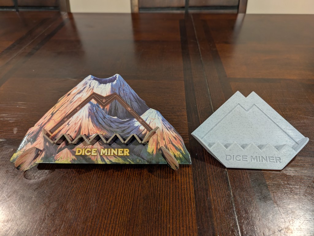 That all being said, there are plenty of issues to point out here that any potential buyer should know. Remember how I said that the components were nice “for the most part”? There is one component that I find sorely lacking in the Standard Edition of the game – the 3D cardboard mountain itself. Sure, the mountain is made out of nice thick punchboard that you assemble yourself in four different pieces but – this is going to be the first (and likely only) part of the game that will eventually fail you. It’s way larger than it needs to be when assembled, which means you need to take the “stand’ off the back of it each time to fit it in the box. You can buy a “Deluxe Edition” of the game that comes with a molded plastic mountain and a plastic dice cup, but even that version of it is WAY bigger than it needs to be, and grows the box size considerably to fit those new components. The very first thing I did when buying this game, was find a nice 3D printable mountain to use with the game, and it’s a HUGE improvement over either the standard or deluxe edition version. It’s sturdy, it’s compact, it’s perfectly designed, and it fits right in the standard edition box with no modification. Huge miss by the game designers to not use something like this fan-made version instead of the version they came up with.