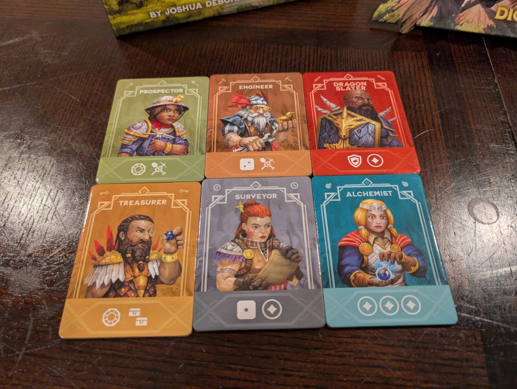 On the other hand, if you love dice…and I mean LOTS of dice (60 of them to be exact), then put on your hard hat and pull up a chair, because the mountain is calling, and it’s time for us to go mine some dice. This is not a complex game – it’s unashamedly a dice rolling-and-drafting game with a tiny smidge of variable player powers from a very basic character selection process.