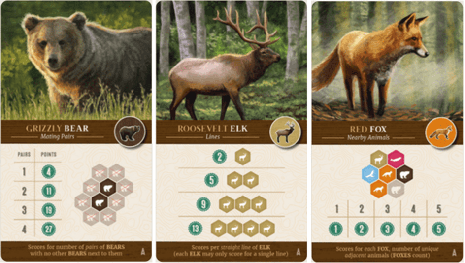 And then of course, you also score based on the wildlife tokens you’ve placed, and this is where the game gets really interesting, and changes each time you play. Each play you choose one rule for how each of the five wildlife types get scored – the game provides you with four different options for each animal, so if you draw randomly and mix/match, that means there are 1,024 different combinations of scoring systems you could come up with (my math is better than my geography apparently). For your first game, the designer recommends using a specific set of the five rules to keep it simple. Bears, for example, like to be placed in pairs, but with no other bears around them – and you score based on how many isolated pairs of bears you can place. Foxes on the other hand, absolutely LOVE a diversity of wildlife – you score one point for each unique type of animal is directly adjacent to any fox you place (including other foxes). And those crazy elk? They demand to be placed in straight lines, and your score grows depending on how long those lines get!