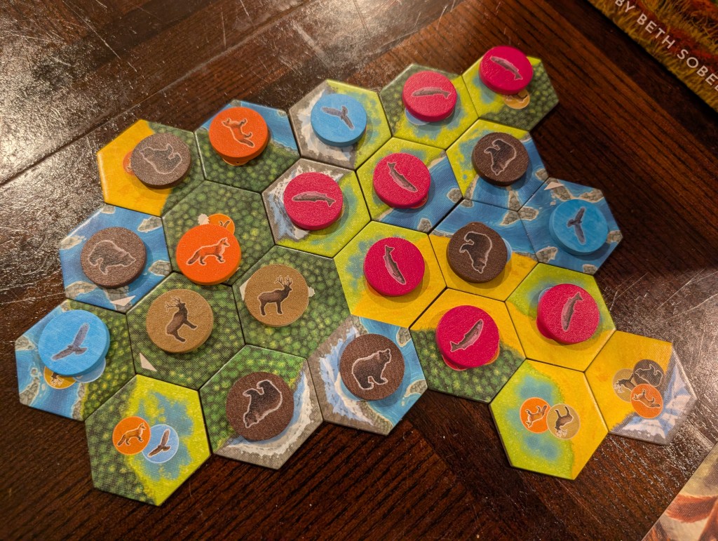 Gosh, it’s hard to really find very much here that I didn’t like. One very minor gripe for me revolves around the wildlife tokens. They are small wooden discs with a separate color for each animal. No issue with the quality of the wood, but they somehow feel…cheap. The animals are only printed on one side of the token, and at least on my copy, the printing doesn’t seem to be perfectly centered on all of them. It would have been nice to find a design to print that embellished the look of the tokens a little more. The other thing, also minor, that feels a little off, are those times when you are able to place wildlife tokens into habitat tiles that just make you chuckle a little bit. Occasionally, you’re going to draft a salmon and then place it…in the middle of a prairie. Or grab yourself that Elk and drop it in its new home…the middle of a wetland. While I totally get why the game is designed this way, that’s about the only very minor thing that sometimes breaks you out of the theme for a minute. Neither of these two complaints affect the gameplay at all though, which is fortunate. Overall, just a really well thought out experience.