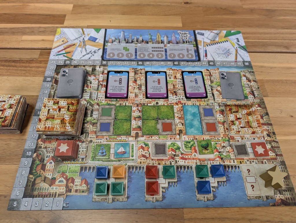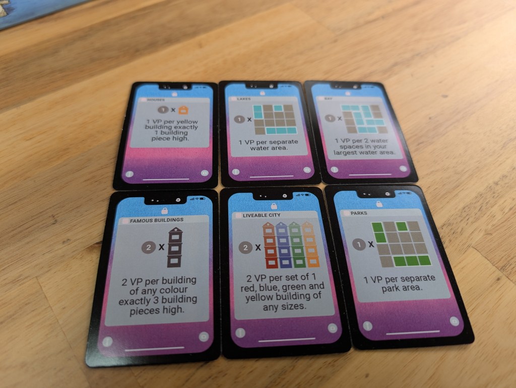 There are 8 rounds played in total in a 3 or 4 player game, ending with each player having exactly a 3×3 grid of city tiles in front of them as the game ends (it is required to build in this shape). Scoring happens in four different ways – you can complete the “city achievements” specific to whichever city scenario you are playing, you can build combinations of certain features in your water or park spaces, you can build monuments in your city that score points, and lastly you score based on the rules in the scoring cards you drafted during the game and how they apply to your specific city design.