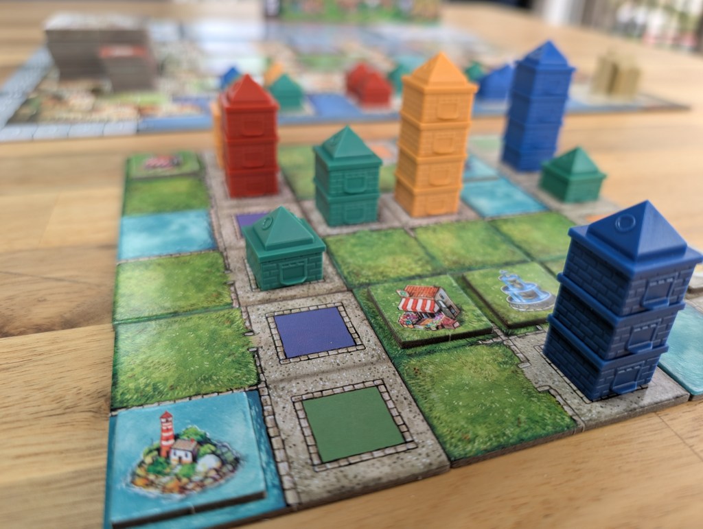One of the coolest parts about Cities is the design of the scoring system. Part of the scoring is defined by fixed parameters shared by all players – you are racing to see who can complete the city achievements first (the earlier you satisfy the requirements for each achievement, the more points you get from it). Everyone is also competing on the same playing field to set up different features in their parks and waterfront areas. But the majority of points come from the rule cards you draft along the way. Sometimes you get lucky and draft a rule card that fits your current build very well, but other times you can find yourself getting stuck with one that doesn’t score you any points yet, and you have to make some adjustments in future rounds to help make the rule card score. This system gives the game a very asymmetric feeling, where every player is working to alter their own scoring system to give themselves the best chance to win. It also creates an additional layer of depth to the game by forcing you to think about playing defense; sometimes you draft a rule card because it denies an opponent more points than a different card may have gained you.