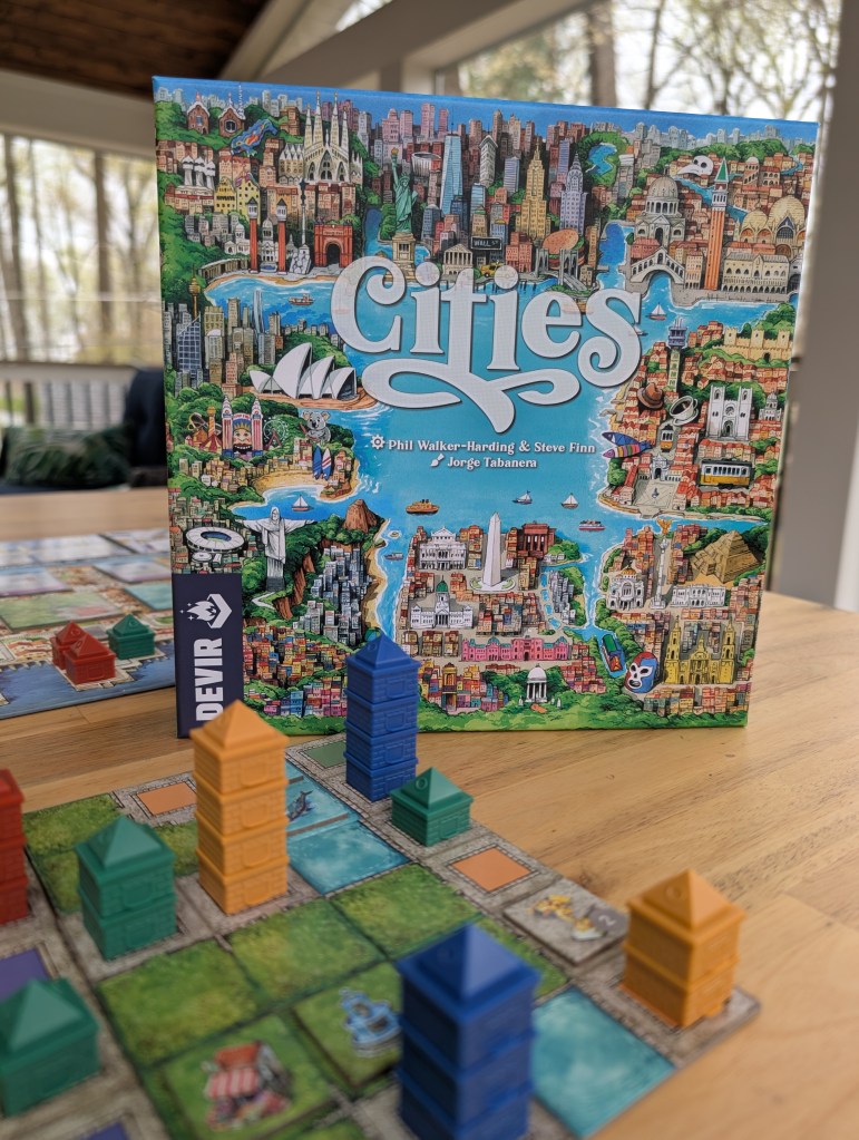 There are some games out there where I hear some really good word-of-mouth recommendations for them and I immediately seek out a copy; or I come across a well-written review that makes it sound right up my alley and I know I need to go try it out. Cities, for me, was not one of these cases. I was wandering around PAX Unplugged 2024 with a group of friends, and after a long day of walking around and trying to see everything, we really just wanted to find an open table in the demo area where we could just all sit down and play a game together without waiting. A group had just finished playing a game and stood up, so we quickly scooted into the open seats without even really knowing what we sat down for. And there in front of us was…Cities, a game none of us had ever heard about before sitting down.