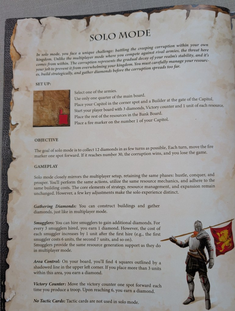 Emporio also offers a solo mode variant, something that I always appreciate seeing included in all games. Instead of battling against a virtual opponent, you’re racing against the clock to try and secure 12 diamonds for yourself in as few turns as possible. Play is tracked by using fire markers (representing corruption) to count out 30 turns; if the game reaches turn 30 without satisfying the 12-diamond victory condition, the corruption has become too great and the player loses the game. There are some adjustments to the rules on how to earn diamonds, and tactics cards are ignored in the solo mode.