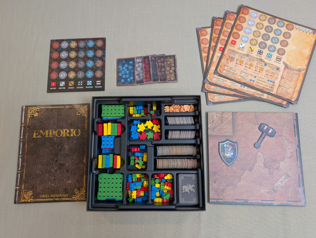 Emporio is a coming-soon-to-Kickstarter game from Uriel Mendoza at M2A games, and I had the privilege to spend a few weeks playing an early copy of the game. Just to avoid the need to caveat this for the rest of the review – although it certainly looks and feels like a finished product to me right now, this is a prototype copy of the game, so the components/design/rules are still potentially subject to change.
