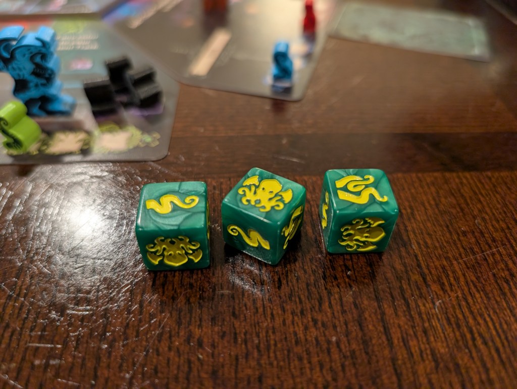 Many of the meeples and other components within may be on the smaller side, but none of them feel cheap or lacking of quality – color me very impressed. There are 140 – yes, you read that right – different painted wooden meeples/tokens inside the box, ranging from very miniscule tentacles, to decently large “Great Old One” monster meeples. All of the cards are nice quality cardstock, there is a nice fabric drawstring bag for use during the game, three small but well-designed plastic dice, etc. The piece that impressed me the most though, was the Wheel of Madness spinner that is set up in the middle of your play area during the game. It’s a very thick, durable feeling piece of cardboard that has a grippy and premium feeling section of non-stick rubber on the back (which it turns out, is very important) – and the plastic tentacle spinner that attaches to the front is very sturdy in design, with great clearance so it spins easily. I’ve played a ton of larger, much higher cost games that involve spinners, and they are rarely ever close to this nice in design. To Scott Almes, or whoever at Gamelyn was involved in the component design for this game – bravo to achieving this level of quality, at this size, at this price point.