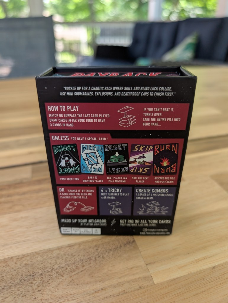 Read through the full online rulebook, and it’s clear the designer knew that he would land a wide variety of gaming groups with Payback. I could completely see this game being used as a drinking card game; and unsurprisingly, scroll down in the rules and they have a recommended rule for drinking (take a shot any time someone has to pick up the pile). Similarly, there are recommended rulesets to modify this game to allow for gambling, 1v1 modes, 2v2 team play, and even a “devil mode” that revolves around a modification in the event that three 6’s are ever played in a row.
