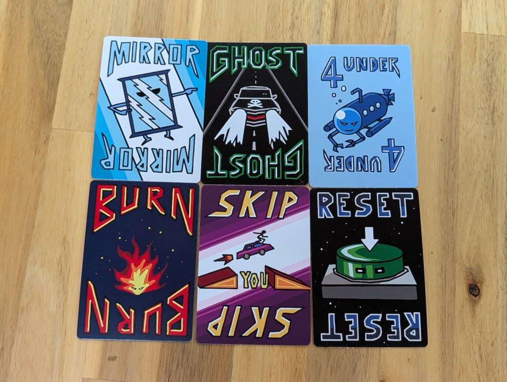 The deck consists of 58 cards, which include four each of the numbers 1 thru 10 (there are no suits or colors, they are all the same as one another), and then 18 different “special cards”. These Special Cards can be played at any time regardless of which number or other special card is on top of the pile. There are four each of Ghost, Burn, Reset, and Mirror special cards, and then two Skip cards; all of these are cleverly very straight forward to remember and are what make the game very interesting. “Ghost” cards essentially count as nothing – it satisfies you having taken a successful turn, but play just continues onwards to the next player who plays off of whatever card was underneath the Ghost. “Mirror” reverses the order of play and sends the game counterclockwise back to the player before you, but only for one turn; if they play successfully, order resumes being clockwise again. “Reset” is actually a nice gesture towards the player after you; it essentially overwrites everything underneath it and the next player to go can play anything they want on top of it. “Skip” skips over the turn of the next player. And lastly, “Burn”, which is probably the best card in the game, destroys the whole pile on the table. The entire pile is removed from play out of the game, and the player who played “Burn” gets to play another card and start a new pile.