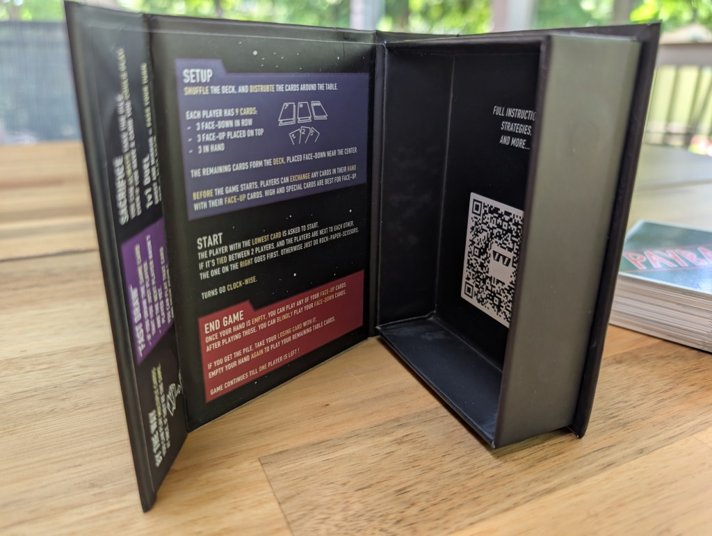 So, what is Payback? If you’re familiar with the card game “Palace”, it sets up and plays similarly to that, but brings in some Uno-like aspects as well. But more importantly – it’s designed from the ground up to function as a fast, quick party game for two to six players. The game comes in a very thick and sturdy cardboard case with a satisfyingly strong magnetic clasp; there is no way this case is opening up by accident, and the snapping sound each time it closes is very gratifying. Inside are 58 thick, quality feeling oversized cards, all of which are used in the game play. There is no included rulebook or unused cards; the rules are printed in various spots all over the box, and more importantly there is a QR code that leads you to a website with a cleverly made (and funny) “how to play” video as well as a more thorough set of online instructions. No doubt that Payback is a lightweight, quick to learn game, but for first timers I would definitely recommend using the QR code and watching the official sub-4-minute video on how to play – it’s all you’ll need. It’s very clear, it’s funny, and you’ll be ready to start playing or teach anyone else immediately.