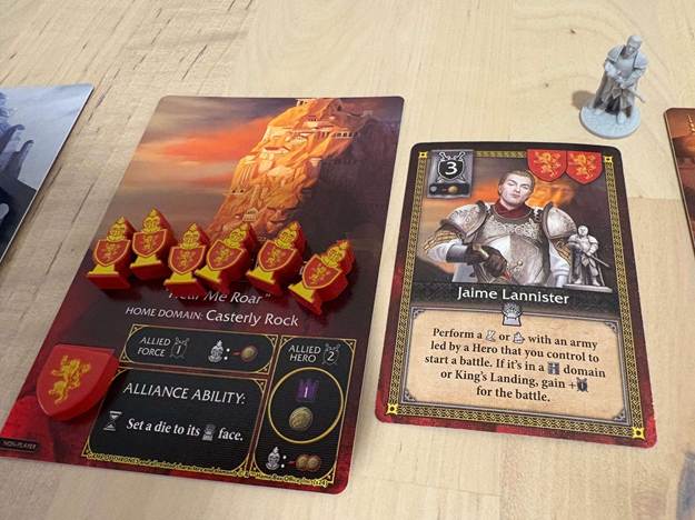 The game’s other major strategic pillar comes in the form of the “ally pool.” Houses not chosen by players are instead set up as potential allies, with their troops tantalizingly already in place in their home region on the map. By gaining influence with these houses using the Plot action on the dice, you collect their troop tokens into your Ally Pool for an opportunity to form an alliance at the end of the round. Successfully ally with one of these houses, and you gain their on-board troops, their castle, and even the chance to spend gold to bring their house’s hero into the game for additional abilities and strategic opportunity.