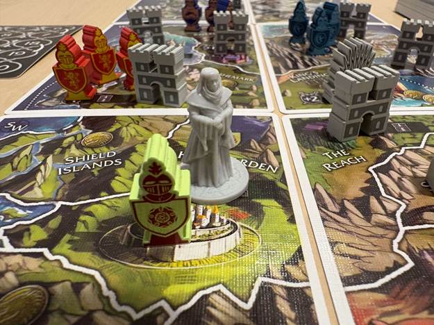 Speaking of battles: They’re a simple, Risk-style numbers game, counting troops and heroes as well as cards played by each player. The losing player retreats and loses a single troop; the winner instantly gains a victory point. A catch-up mechanic represented by “Valar Morghulis” tokens can be gained as the game goes along that gives a player who’s fallen behind extra victory points simply for starting battles – a great way to simultaneously prevent landslide victories and to encourage aggression across the table.