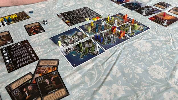 This visual splendor takes some time to come together and even more to play out across the game’s six rounds. My initial playthrough of this game took nearly 20 minutes for the initial set up, and initial rounds can be sluggish too as your players grapple with the game’s many rules and reference iconography. As with “Cthulhu”, this game features compatibility with the free “Dized” app for a more streamlined experience in both set up and play. It’s worth trying, though in my experience the 24-page rulebook does as well as it can to balance “put this there” directions with context and explanation, so that as you read and perform setup, you’re learning aspects of play that will be valuable as you transition to round one.