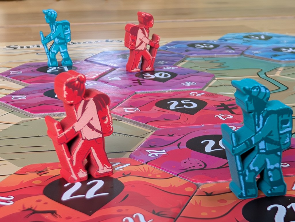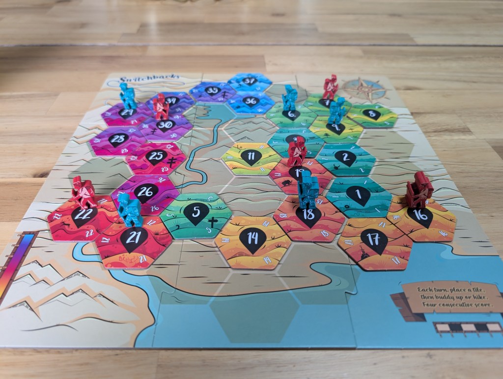 I think it plays fine at all player counts, but my recommendation would be to go with 3 or 4 players if possible. In a duo game, I still think it is fun, but it plays much differently – even with two hidden tiles each, both players will still be able to figure out where the breaks in the sequence are most likely to occur based on where the only opponent chooses to place their hikers. Honestly, the best thing about Switchbacks is that it’s a unique game where you actually have to work together with your opponents for either of you to score most of the time. Your hand size is limited to a max of three tiles at any one time, and a completed trail requires at least four consecutive numbers. Later in the game you’ll probably have some good info on which trails can be completed, but for the first 2/3rds of the game, you’ll probably have to place some hikers and tiles based on the faith that your opponents will see your optimism on finishing the trail and join you in adding to it. At the same time, you still need to be cautious with the information you reveal by which tile you choose to play and where you play it. You might see an opponent building up a ton of hikers on an incomplete trail, and be holding a key tile in your hand to complete it, and choose to just play it all the way on the other side of the board. I LOVE the decision to allow players to place a tile literally anywhere they want – it does not need to touch an existing tile, it can be played in the middle of nowhere on any empty space if you so choose.