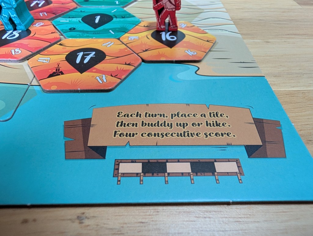 Too simple, you say? Well, not quite so fast. There are a few things making this a little bit trickier than it sounds. At the start of each game, each player is secretly dealt one facedown tile that they get to look at (or two each in a 2-player game), that is ineligible to be played during the game. You’ll have knowledge of your own tile(s) that will never show up on the board, but other players will carry their own secrets. This ensures that there will be random breaks in the sequence where some trails just won’t be able to be continued, and the players will have to try and deduce where those breaks might be as the game is played. The other thing making this tricky – on every single turn, you either have to play a hiker on your own played tile, or you have to choose to “buddy up” two hikers together, that have to be played as a pair in a future turn. If you reach the point where ALL of your hikers are buddied up, you’ll have to place a hiker every single turn after that. This is difficult especially early in the game, when you’ll have to make decisions on placing hikers long before you can be sure they will end on a completed path.
