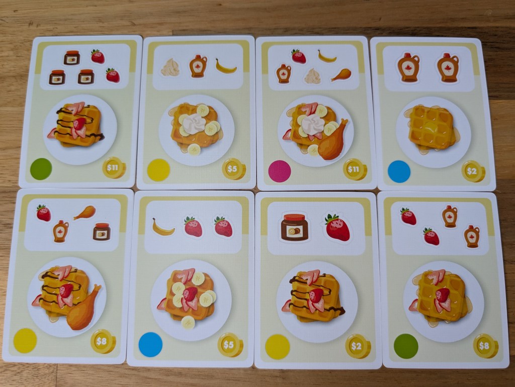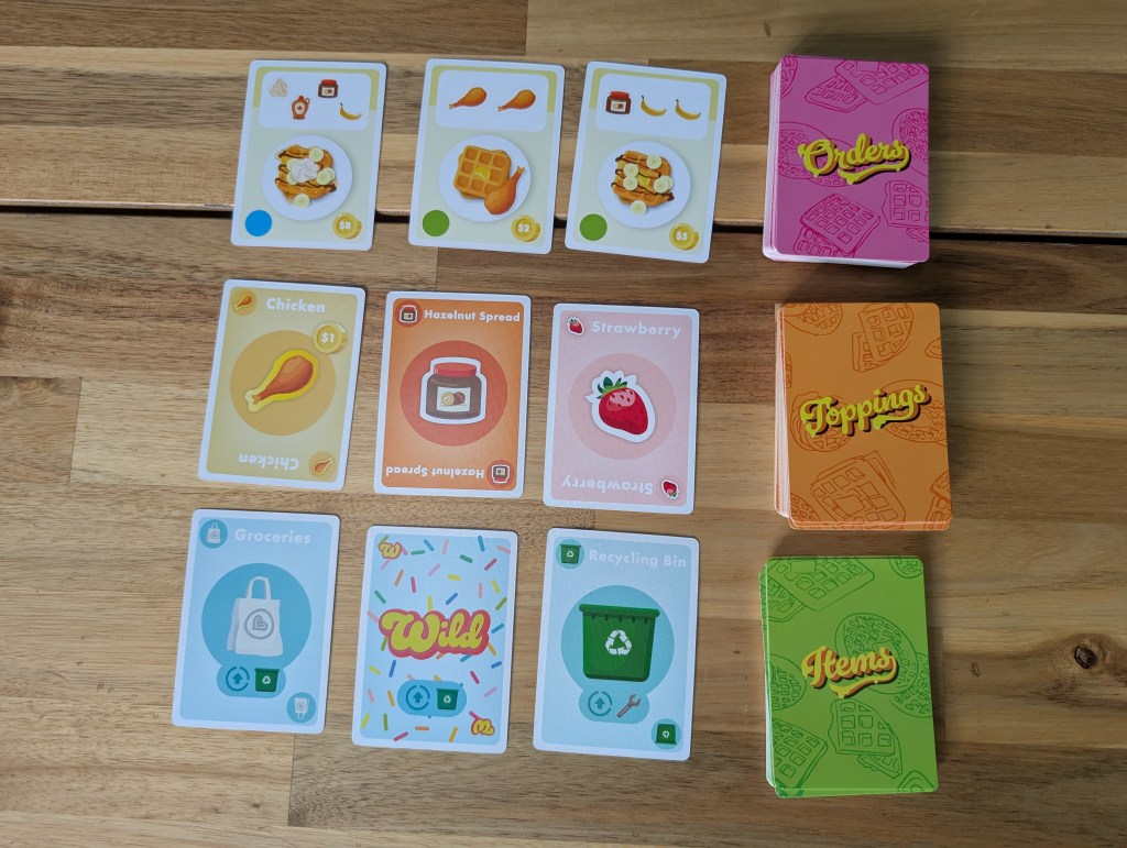 Top Waffle is a card game for 2-6 players, and it’s a fairly lightweight game to setup and explain. Some of this varies by player count, but in a typical setup you will see a 3 x 3 grid of cards in the center of the table. The top row of this grid consists of “order” cards, which represent customer orders that need to be fulfilled by the players. These order cards show anywhere from 2 to 5 toppings required to complete the order, a picture of the delicious creation, and lastly a value for the number of dollars (essentially victory points) you will achieve for fulfilling the order. The next row of three cards are, you guessed it, “toppings” cards which show a picture of either one or two ingredients, and sometimes contain a bonus victory point value that unlocks when they are used to fulfill an order. And lastly, the bottom row contains “item” cards, which can contain one of six different items available to players in the game. These items allow special powers to the player, such as the ability to act as a wild card, or letting the player look through the next 3 toppings cards on top of the deck.