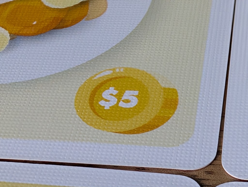 My other issue, which is more minor, is that this is a game that you need to commit to playing just to have fun and not overthink things. After a few rounds, it dawned on me that items cards seem a little too overpowered in the game, and often times there was almost no reason to grab any new toppings cards unless it would allow me to directly fulfill an order the very same turn. This is due to the negative points risk for unused toppings cards at the end of each round, but no such negative risk for items cards (which can also be carried through to the next round with no penalty). And one last gripe, minor gripe – there is one accessibility issue with the printing on the cards we noticed – I’m not sure why, but the decision to show a yellow coin icon on the “order” cards, with a plain white number value written in the middle makes the order values nearly impossible to see unless you lean in to look very closely. This held true for both the adults that played (including myself, with near 20:20 vision) and the kids as well. I wish they’d reprint the Order cards with black text instead of white text to make those numbers more easily visible.