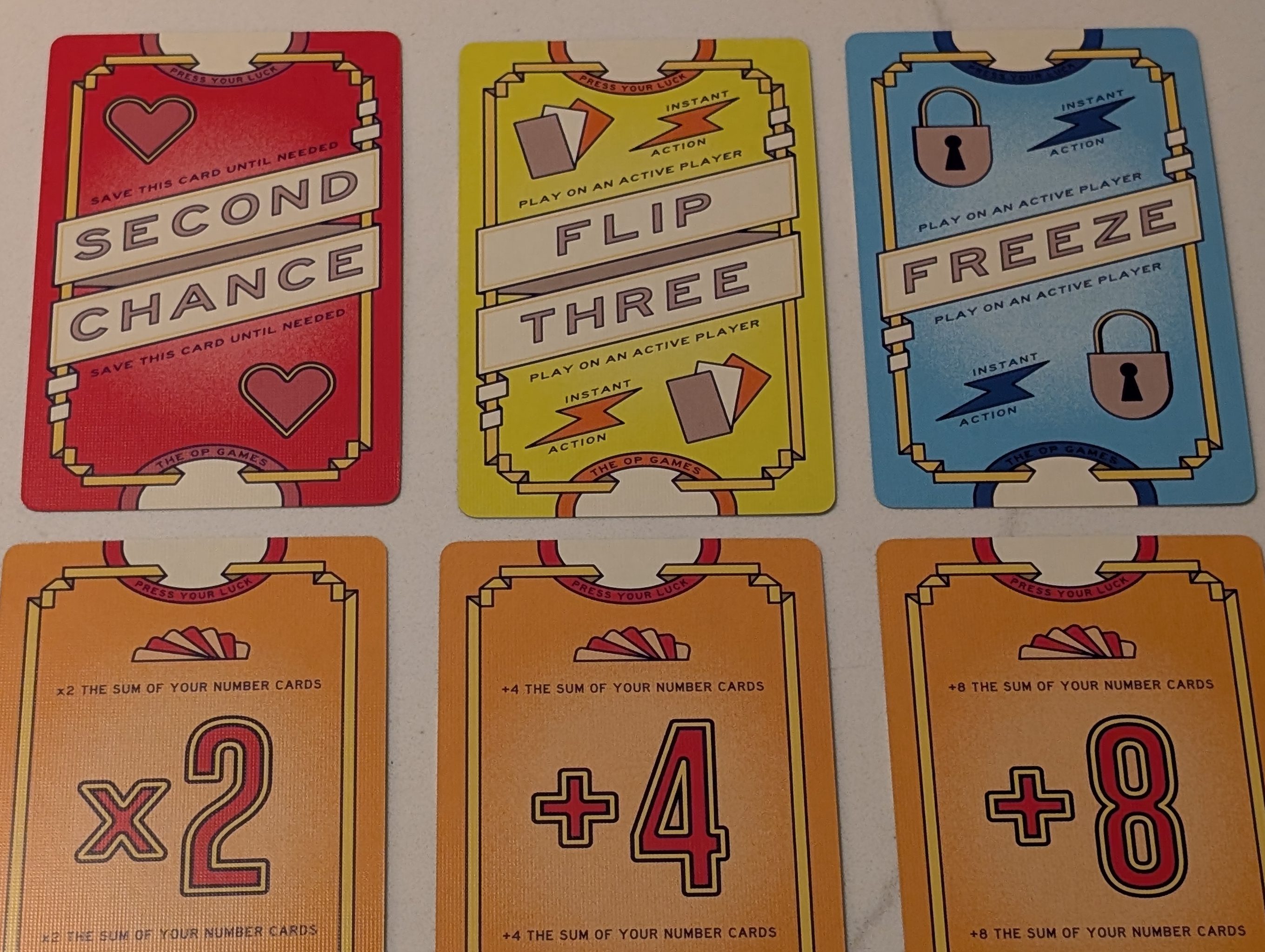 There are special cards mixed into the game as well, which can make things more interesting. You can draw a freeze card, which immediately ends the round for you and acts the same as saying “stand”. There is also a “Flip Three” special card, where you immediately have to take a hit from the top 3 cards on the deck with no opportunity to stand – this one usually ends up being either VERY good for you, or VERY bad, and not usually anything in between. And lastly, possibly the most valuable special card is “Second Chance”. This is the one special card that you keep in front of you when dealt, and you can use it to cancel out a duplicate card you receive. So essentially, once you have this card, you can really stretch out how far you press your luck, knowing that you’re safe from the next duplicate card you receive. But there is still some risk – this card doesn’t allow you to cancel out a “Freeze” card for example, so you can still end up with a low scoring round.