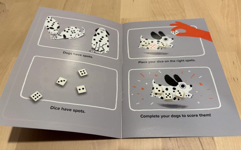 Rules are minimalist, and so are the drawings. The dice themselves have pips of mismatched sizes, adding to the goofy visual appeal of the whole package. The color scheme and design is kept limited – blue, black-and-white, with rare pops of other colors for emphasis on top of line-sketch dogs that exaggerate charming features and poses. This is an all-ages kind of game with the curb appeal to match.