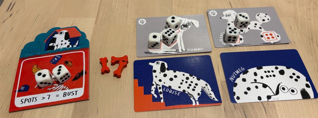 There are two places for each player to place their dice rolls: either on their dogs, or in their yard. Dogs have a random assortment of specific rolls; the yard can be used to “bury” dice rolls that don’t match, but can only hold a total value of seven or less pips at any time. If you push your luck too hard and go over that number, you lose all your placed dice, meaning you have to reset any dogs you haven’t officially scored yet. Add in some cute bone tokens that you can use to re-roll, and that’s about it for rules and components.
